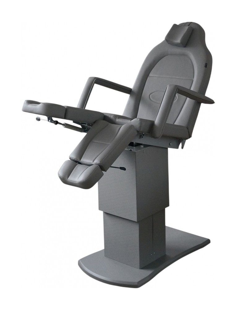 ​Педикюрное кресло оснащено двумя электромоторами, обеспечивающими регулировку высоты и угла наклона сиденья. Опоры для ног фиксируются при помощи газ-лифтов. Кресло легко раскладывается в горизонтальное положение, образуя ровную поверхность. Надежная конструкция системы подъема обеспечивает высокую устойчивость кресла даже при максимальной высоте. Управляется при помощи ручного проводного пульта. Дополнительно при производстве могут быть установлены различные опции.