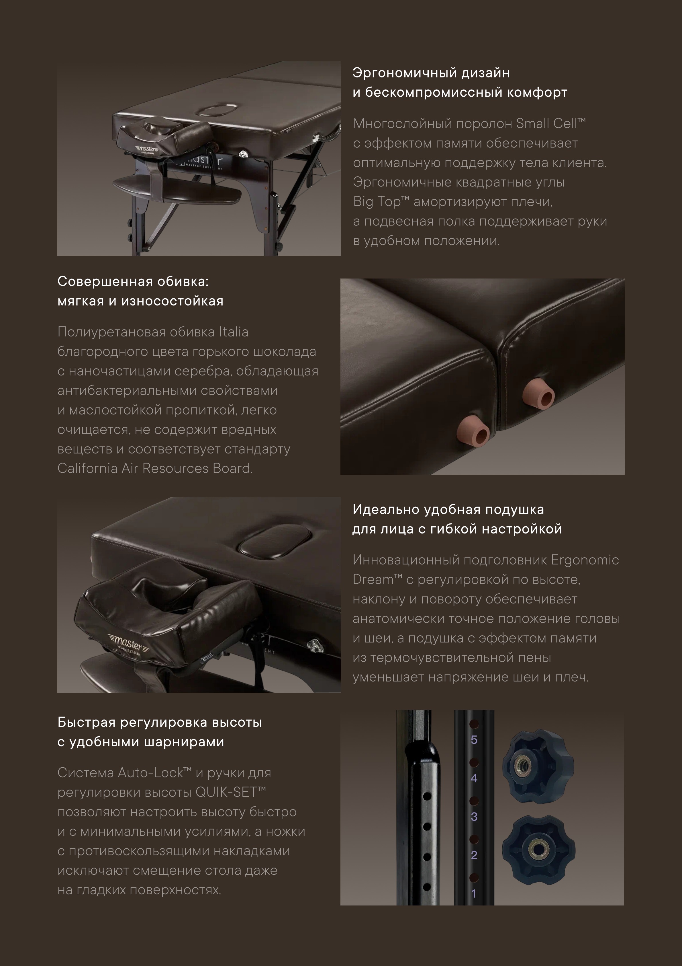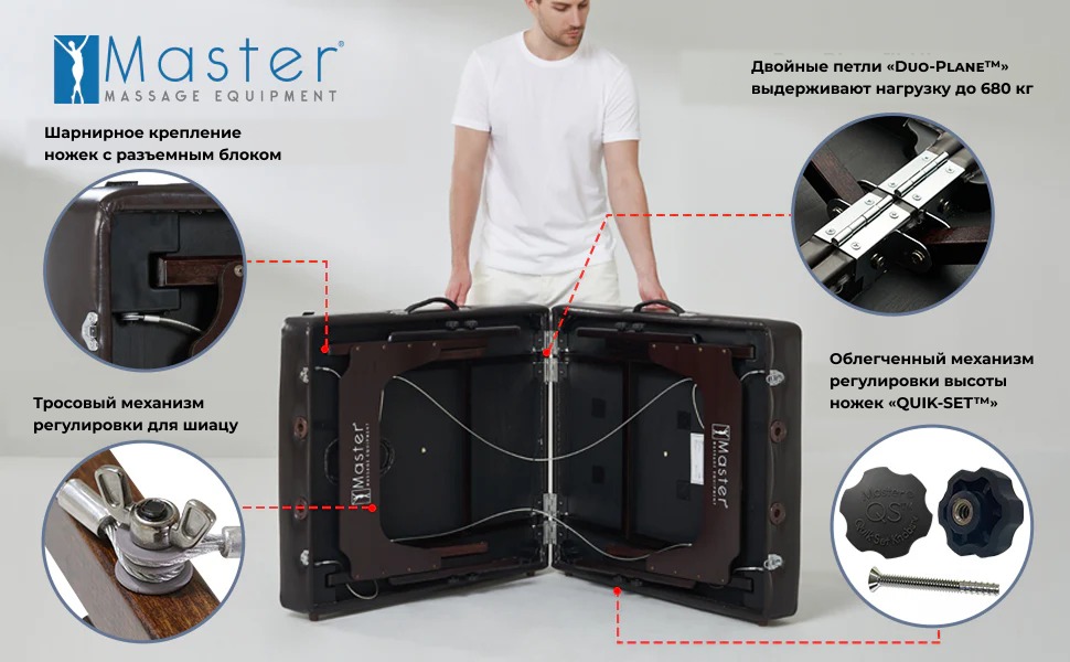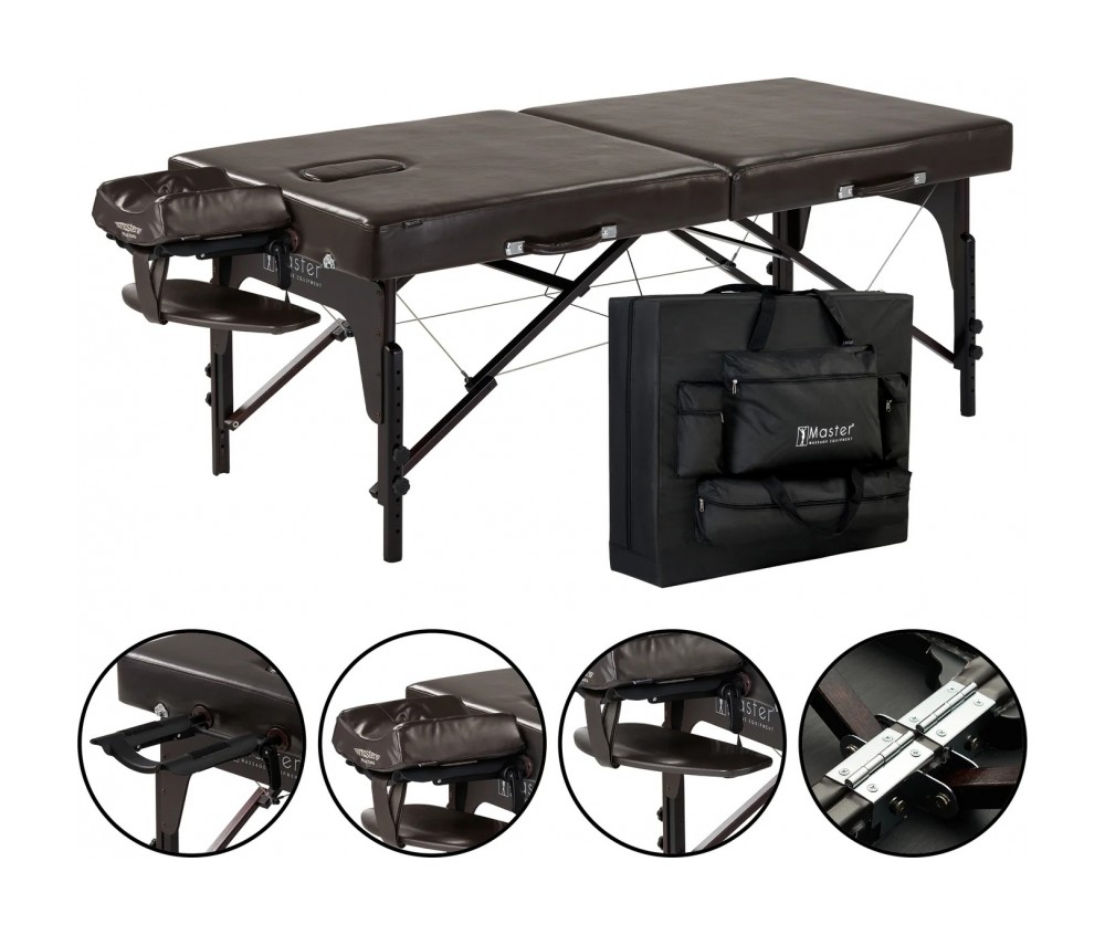 -Вся деревянная конструкция — не содержит формальдегид и канцерогены, соответствует строгим экологическим требованиям штата Калифорния (CARB). -Увеличенное ложе BIG TOP™ — на 26% больше мягкой поверхности благодаря расширенным плечевым зонам. -Прямоугольные углы — обеспечивают более естественную и расслабленную поддержку плеч, согласно анатомическим исследованиям. -Матрас толщиной 7.6 см (3 дюйма) из многослойной пены Small Cell Foam™ — включает слой пены с эффектом памяти (Memory Foam). -Анатомическое лицевое отверстие с заглушкой — удобно для клиента и практично в ограниченном пространстве. -Reiki-панели — усиленные панели под ножками в 2 раза прочнее стандартных, для лучшей устойчивости. -Обивка Italia PU — водо- и маслостойкая, без CFC, усилена джинсовой подкладкой для повышенной износостойкости. -Ножки из твёрдой древесины цвета кофе — покрытие Dura-Seal™ придаёт глянец и защищает от повреждений. -Система Auto-Lock™ — моментальная и надёжная установка стола. -Пронумерованные отверстия — для быстрой и точной регулировки высоты. -Петли DUO-PLANE™ — обеспечивают максимальную прочность по центру стола. -Нескользящие и не пачкающие ножки — безопасны для любого типа напольного покрытия. -Нейлоновые вставки в ножках — исключают скрипы и расшатывание. -Стабилизирующая перекладина — усиливает конструкцию и облегчает складывание. -Крепления Clevis Block™ — гарантируют прочное и надёжное крепление ножек. -Регуляторы высоты QUIK-SET™ — позволяют менять высоту с усилием на 70% меньше, чем у стандартных ручек. -Двойные застёжки чемоданного типа — надёжно фиксируют стол в сложенном положении.