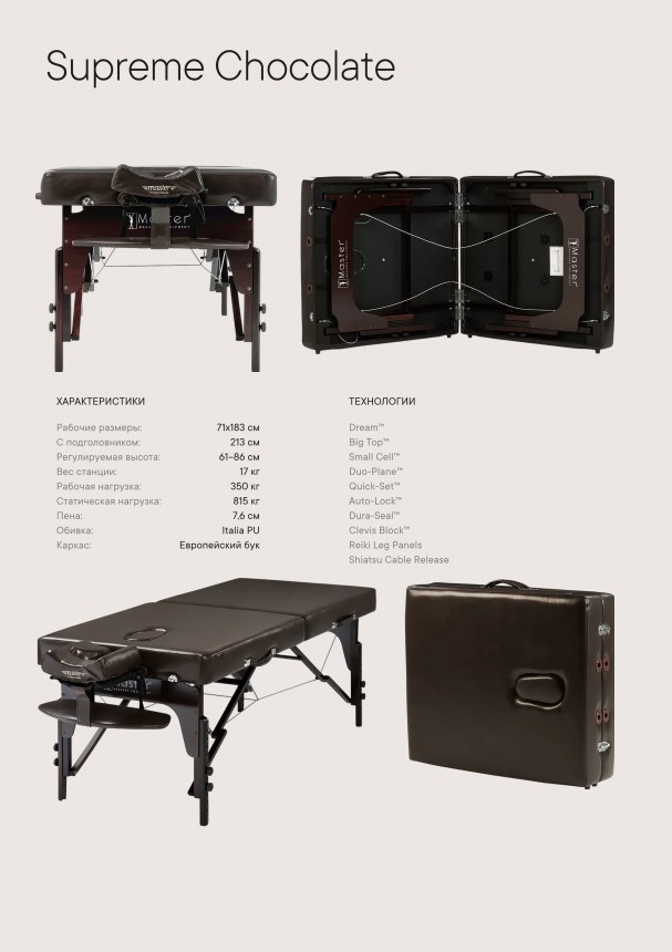 Массажный стол Supreme — это идеальное сочетание простора, комфорта и надёжности в премиальном исполнении. Рабочая поверхность стола имеет размеры: ширина — 71 см, длина — 213 см(с учетом подголовника), что обеспечивает удобство как для клиента, так и для мастера. Высота регулируется в диапазоне от 61 до 86 см, это позволяет адаптировать стол под индивидуальные потребности. Оснащённый матрасом толщиной 7,6 см из многослойной пены Small Cell Foam™ с дополнительным слоем пены с эффектом памяти (Memory Foam), стол обеспечивает высокий уровень комфорта даже во время продолжительных процедур. Прямоугольные углы конструкции способствуют более естественному положению плеч и помогают снять напряжение, а анатомически оформленное лицевое отверстие с заглушкой удобно при работе в ограниченном пространстве. Стол усилен удвоенными Reiki-панелями под ножками, что делает его устойчивым и позволяет мастеру работать в сидячем положении. Дополнительную прочность конструкции обеспечивают соединения Clevis Block™ и стабилизирующая перекладина. При всём этом стол остаётся мобильным — вес составляет всего 17,2 кг, что делает его удобным для транспортировки и выездной работы. Модель выполнена в стильной обивке цвета «шоколад» из износостойкого и экологичного материала Italia PU с декоративной французской строчкой. Обивка устойчива к воздействию масел и влаги, не содержит вредных веществ (CFC-free), и прослужит долго даже при активном использовании. Стол оснащён надёжной системой быстрой установки Auto-Lock™, а ножки снабжены нескользящими и не оставляющими следов накладками, безопасными для любого пола. В комплект входят: регулируемый подголовник Ergonomic Dream, подушка для лица из пены Memory Foam, подвесная полка для рук с мягкой обивкой и удобная сумка-чехол с четырьмя карманами для аксессуаров. Master Massage Supreme — это профессиональный массажный стол, который сочетает в себе эргономику, качество и роскошь, отвечая самым высоким требованиям специалистов.