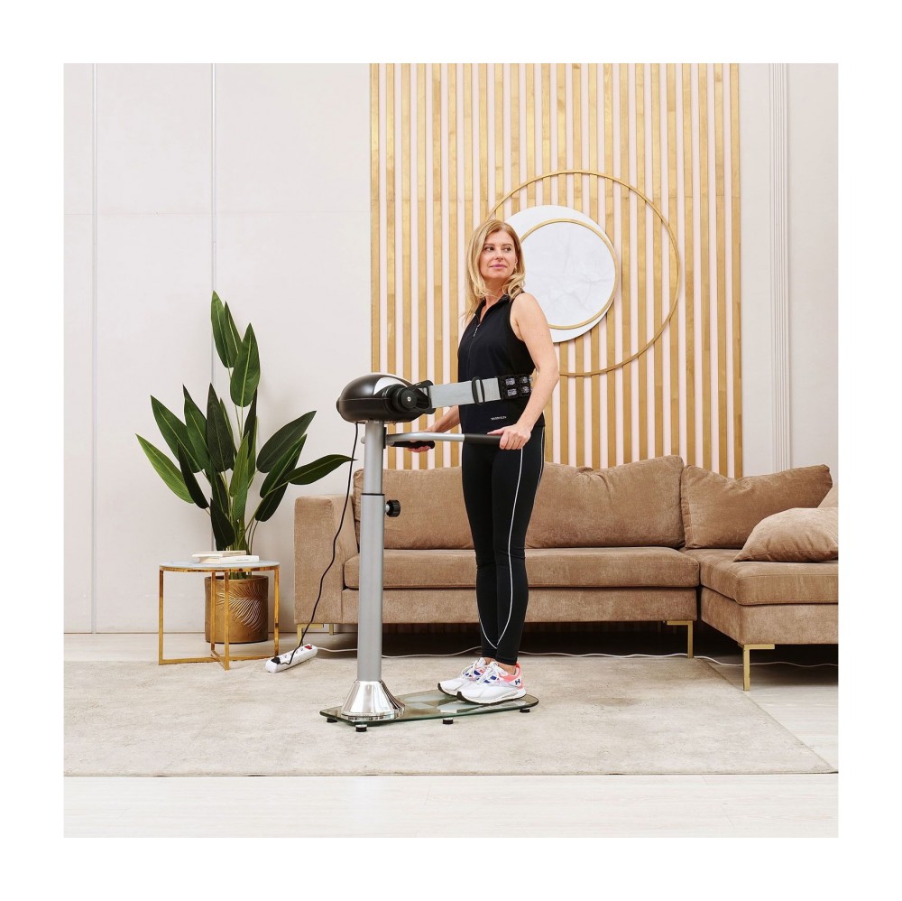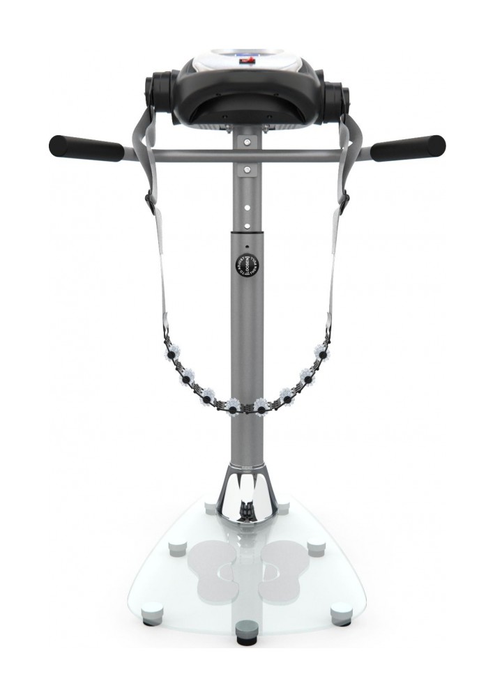 Удобство конструкции Массажёр имеет компактную и надёжную конструкцию. В качестве основания использована гальваническая труба диаметром 76 мм и толщиной 1,5 мм. Платформа выполнена из закалённого стекла. Максимально допустимый вес пользователя — 110 кг. В комплектацию входят 2 массажных пояса, которые крепятся к передней консоли. Для удобства и безопасности предусмотрены два поручня по бокам.